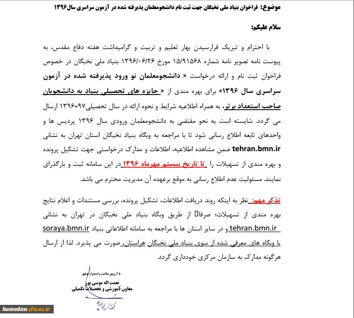 فراخوان بنیاد ملی نخبگان جهت ثبت نام دانشجو معلمان پذیرفته شده در آزمون سراسری سال 1396