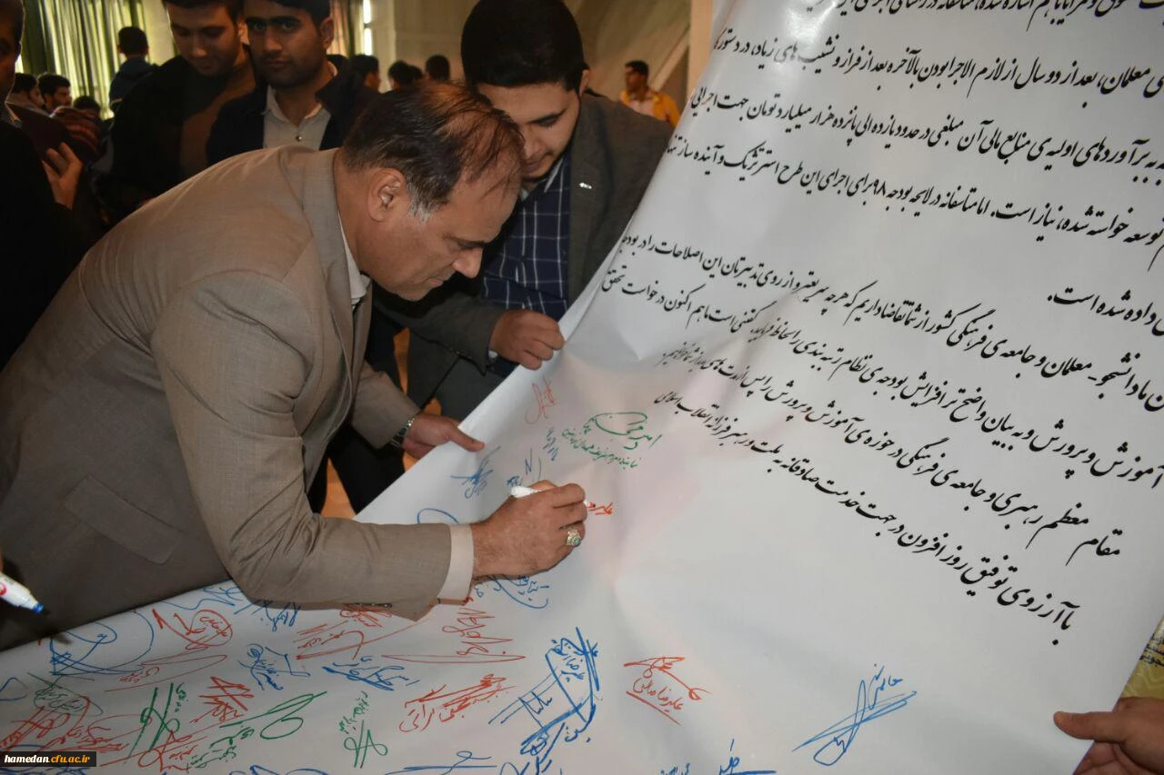 مطالبه گری دانشجو معلمان دانشگاه فرهنگیان همدان از ریاست محترم جمهور با امضای طوماری در حاشیه مراسم روز دانشجو