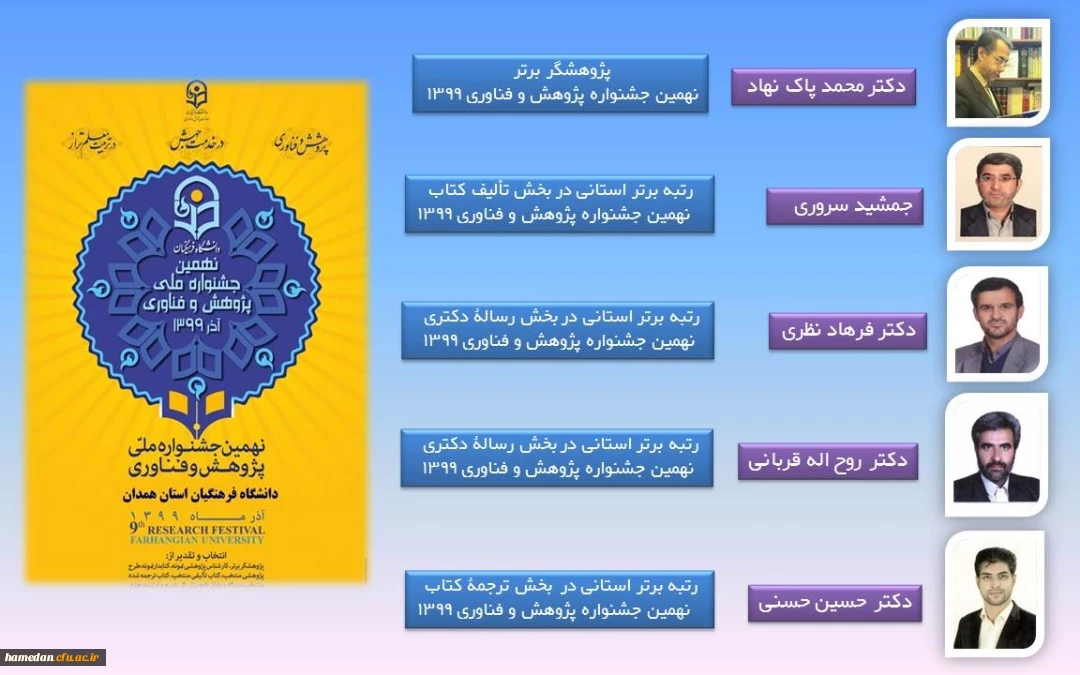 امتیاز دهید : پژوهشگران برتر مرحله استانی ( نهمین جشنواره ملی پژوهش و فناوری) 3 یکشنبه 30 آذر 1399 ساعت 13:34