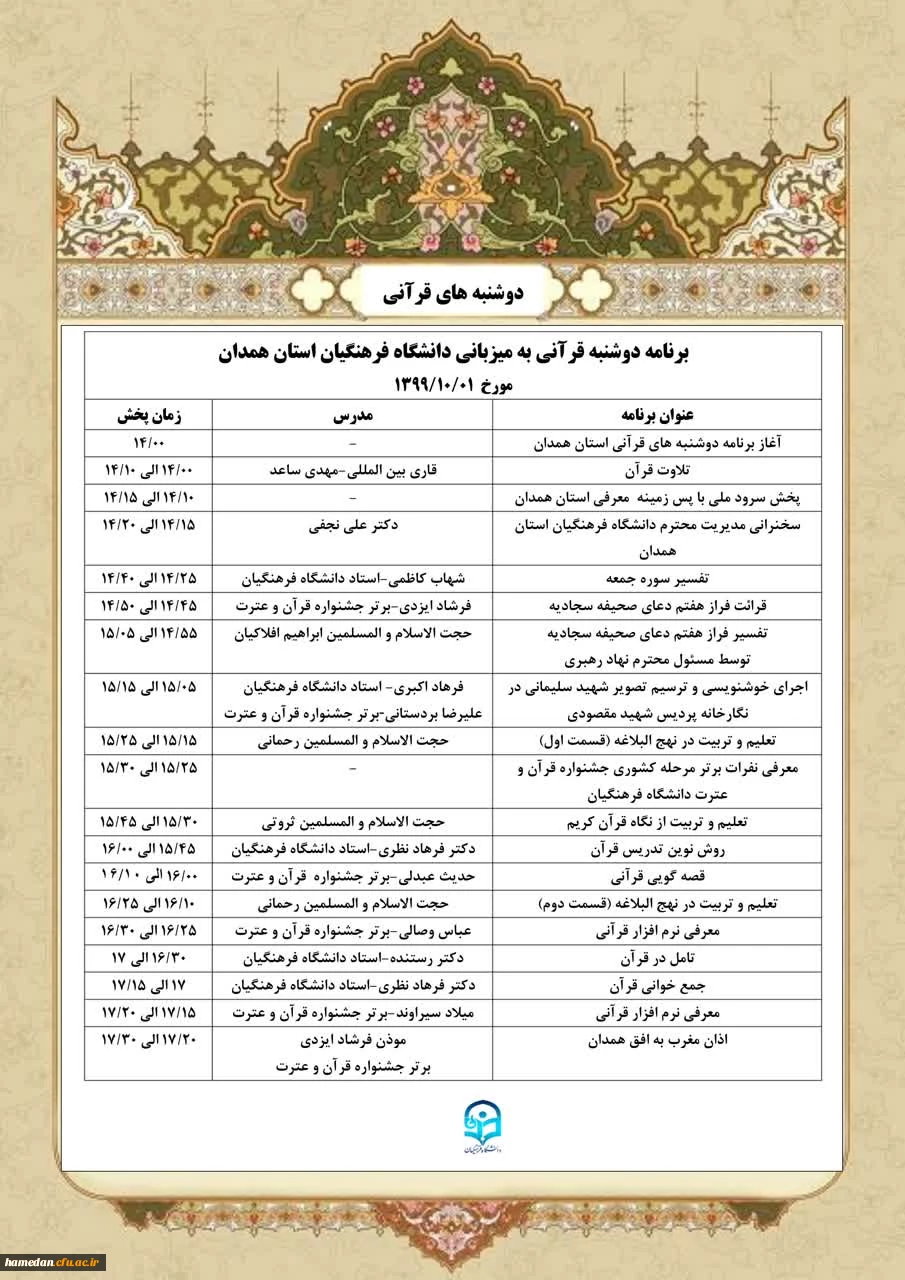 طرح دوشنبه های قرآنی معاونت فرهنگی و اجتماعی دانشگاه فرهنگیان در مورخ ۹۹/۱۰/۱ به میزبانی استان همدان در حال برگزاری است 2