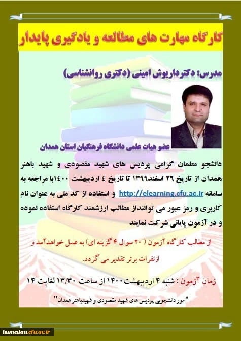 امتیاز دهید : برگزاری کارگاه مهارت های مطالعه و یادگیری پایدار با تدریس دکتر داریوش امینی 3 یکشنبه 29 فروردین 1400 ساعت 8:35