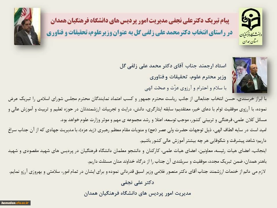 استاد ارجمند جناب آقای دکتر محمد علی زلفی گل وزیر محترم علوم، تحقیقات و فناوری 2