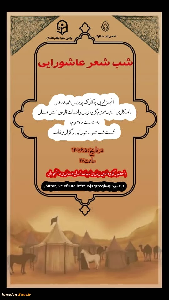 امتیاز دهید : انجمن زبان و ادبیات فارسی چکاوک پردیس شهید باهنر همدان برگزار می کند 2 شنبه 5 شهریور 1401 ساعت 7:27