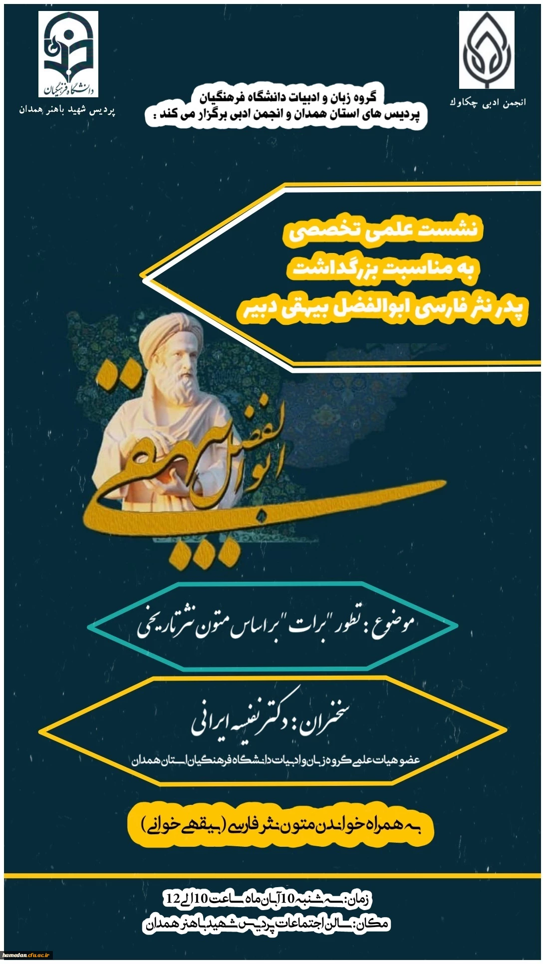 امتیاز دهید : نشست علمی تخصصی به مناسبت بزرگداشت پدر نثر فارسی ابوالفضل بیهقی 2 دوشنبه 9 آبان 1401 ساعت 14:04