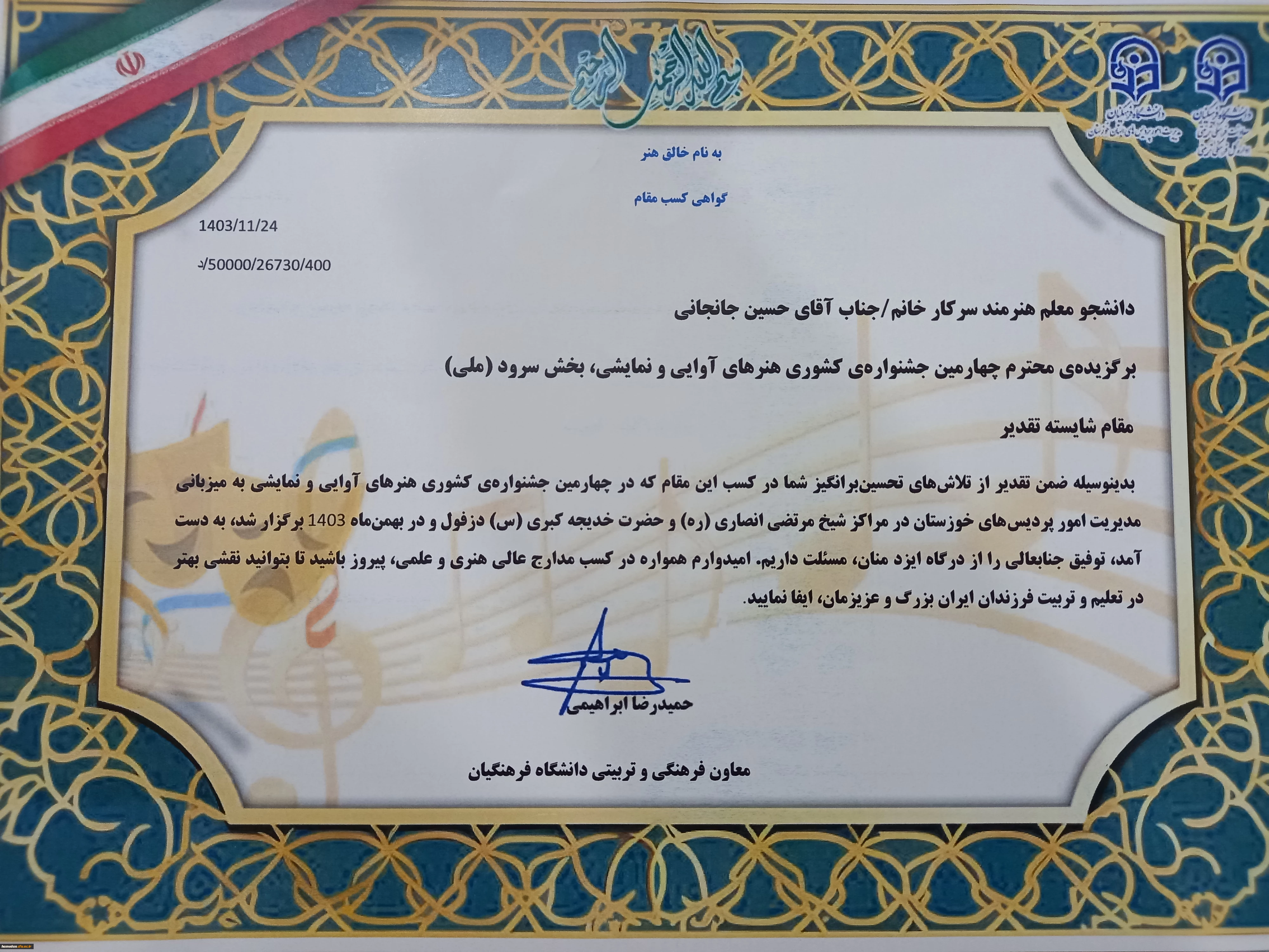 کسب رتبه های برتر در جشنواره کشوری سرود و هنرهای نمایشی دانشگاه فرهنگیان کشور 5