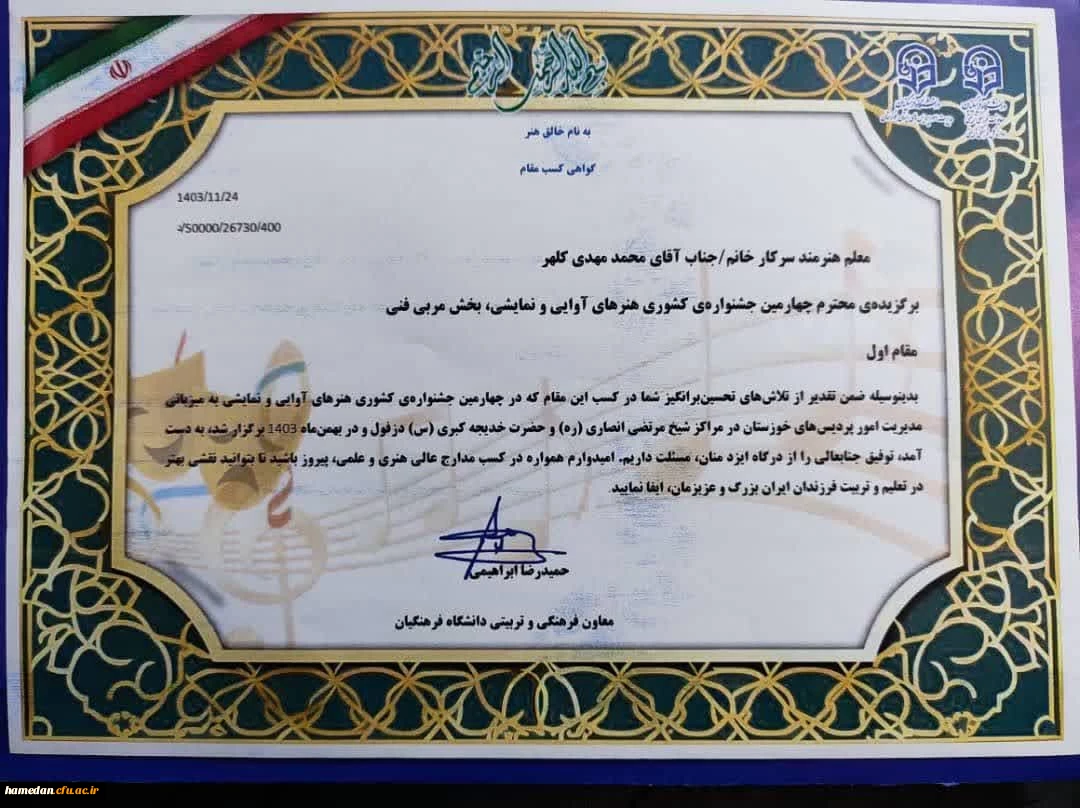 کسب رتبه های برتر در جشنواره کشوری سرود و هنرهای نمایشی دانشگاه فرهنگیان کشور 7