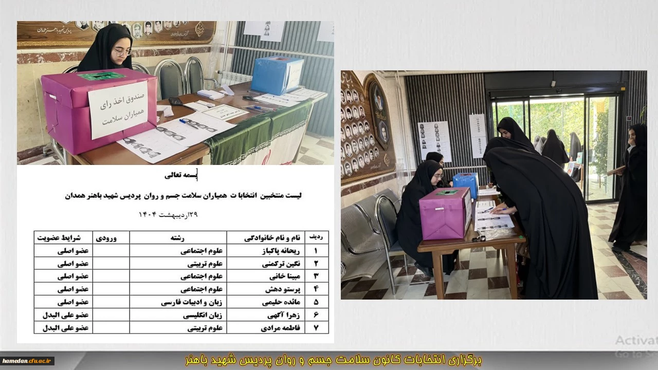امتیاز دهید : برگزاری انتخابات کانون همیاران سلامت جسم و روان در پردیس شهید باهنر همدان 2 چهارشنبه 31 اردیبهشت 1404 ساعت 22:10